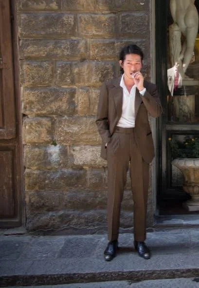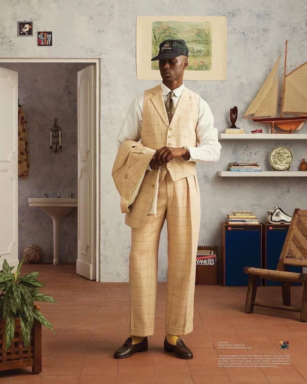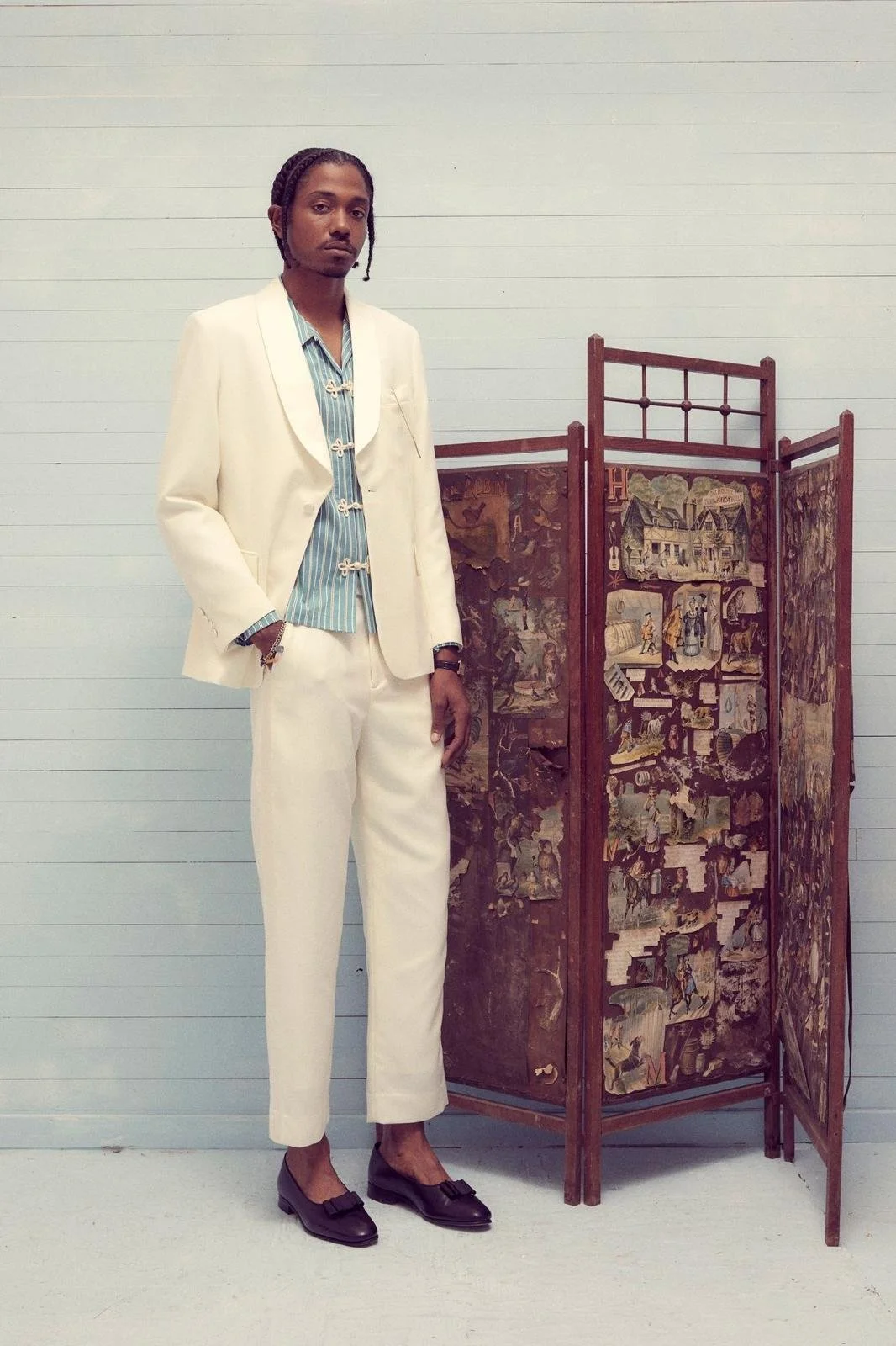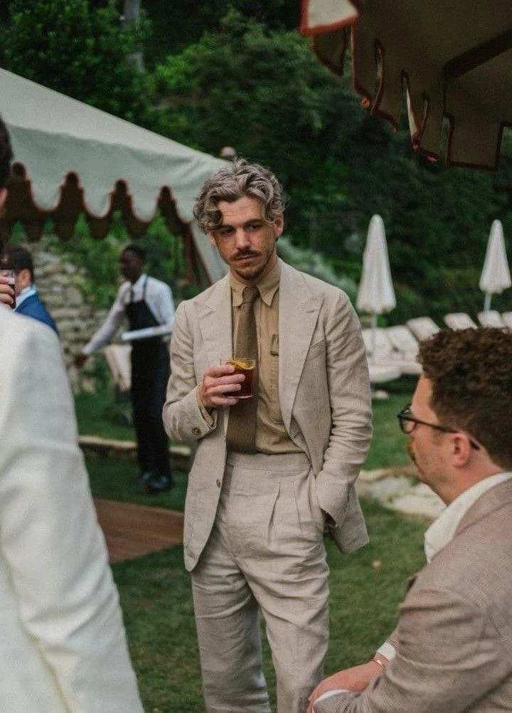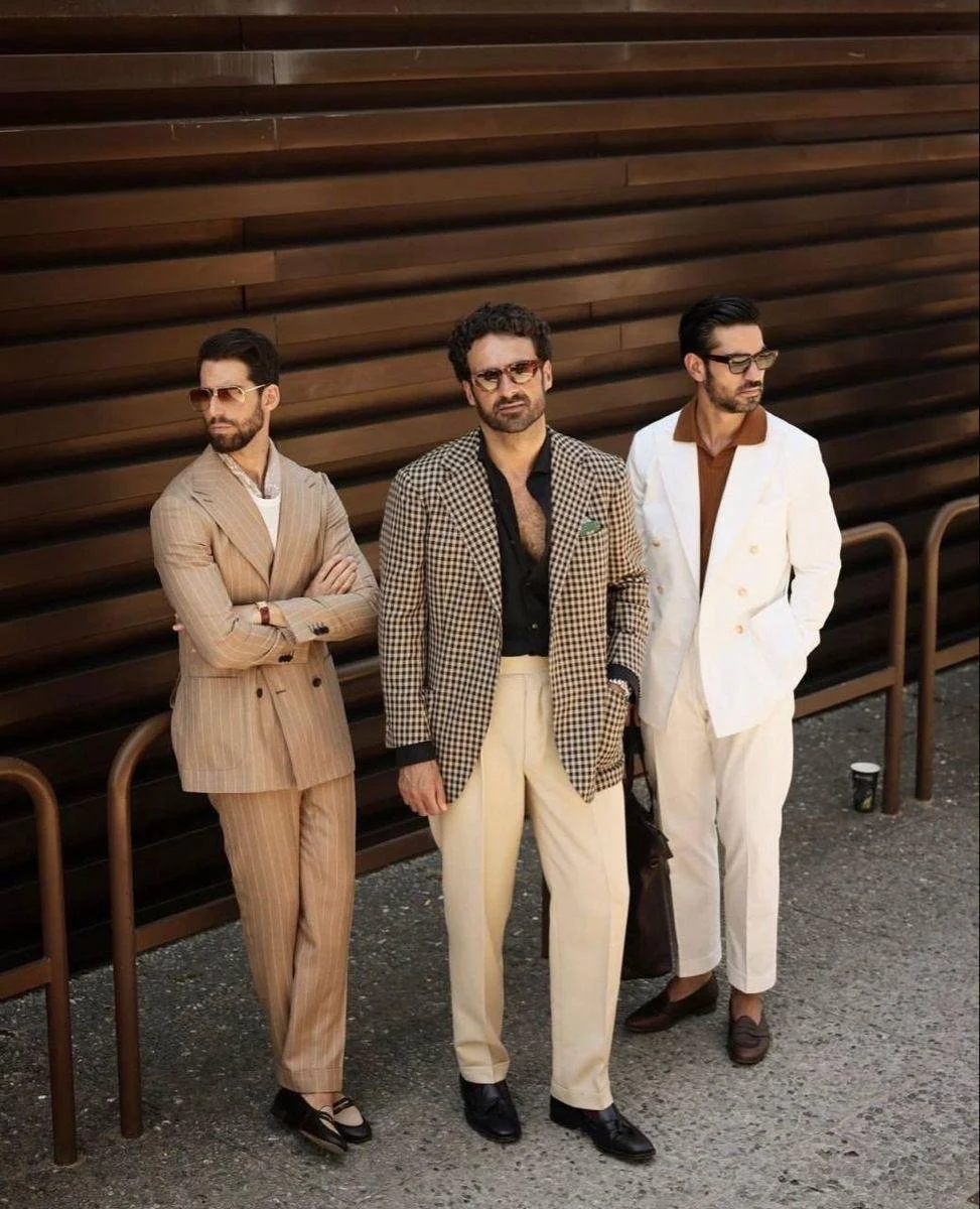 Gentlemen should wear light suits in blue, green, brown, or creme.